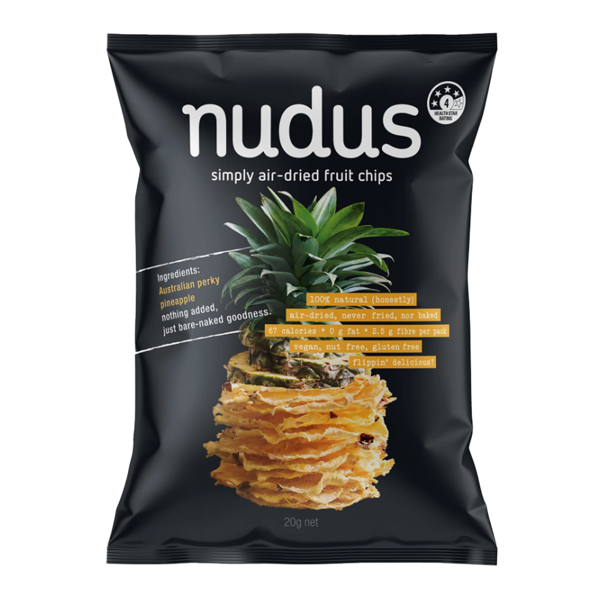 Nudus Pineapple Airdried Chips 20g: Enjoy guilt-free snacking with our deliciously crispy pineapple chips. Packed with natural sweetness and nutrients, these airdried chips are the perfect on-the-go treat for a healthy lifestyle. Try them now for a tropical burst of flavor in every bite!