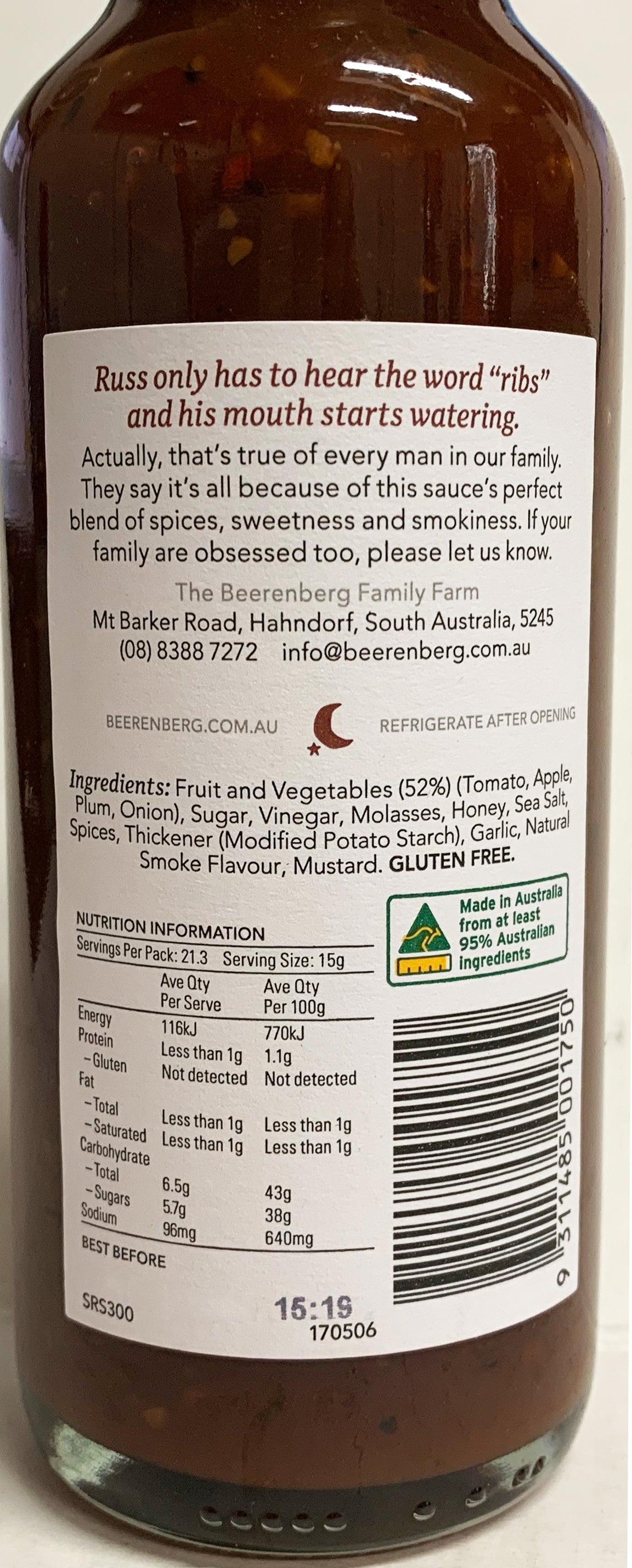 Beerenberg Sticky Rib Sauce 300ml: Elevate your BBQ game with our mouthwatering sauce that delivers irresistible flavor and perfect stickiness to your ribs. Made with premium ingredients, this sauce will have your guests coming back for more. Perfect for grilling enthusiasts and BBQ lovers.
