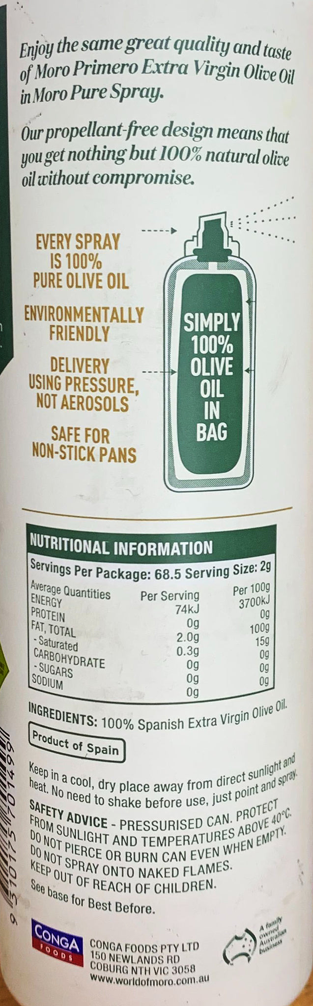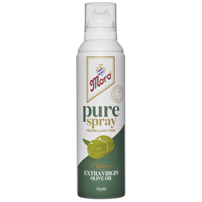 Moro Pure Spray Primero Extra Virgin Olive Oil 137g: Elevate your dishes with the rich flavor of premium olive oil. Convenient spray format for easy, mess-free application. Enhance your cooking with the finest quality oil, sourced from the Mediterranean. Ideal for salads, grilling, and more. Experience culinary excellence with Moro Pure Spray Primero Extra Virgin Olive Oil.