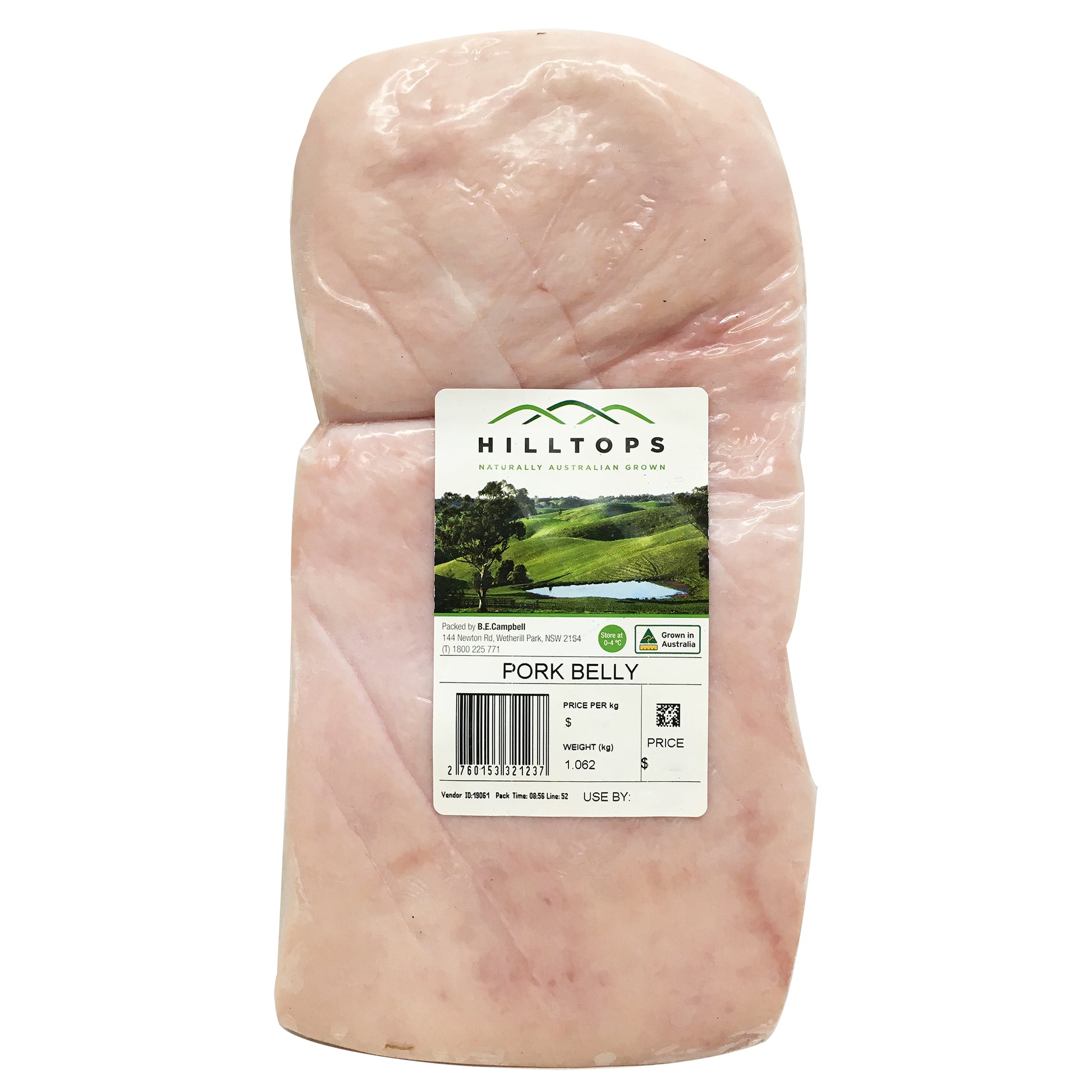 Tender and flavorful Pork Belly from Hilltop, weighing between 800g-1.1kg. Perfect for creating mouthwatering dishes with rich taste and juicy texture. Elevate your cooking with this premium cut of meat.