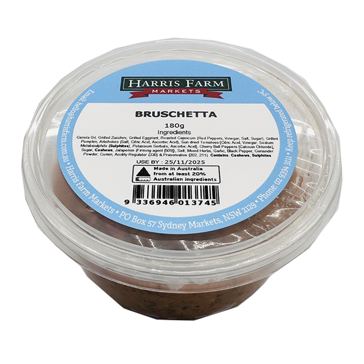 Harris Farm Bruschetta 180g: Elevate your meals with our fresh and flavorful bruschetta. Made with the finest ingredients, our bruschetta adds a burst of Mediterranean taste to your dishes. Perfect for quick and delicious appetizers or as a topping for pasta and grilled meats. Experience gourmet quality at home with Harris Farm Bruschetta 180g.