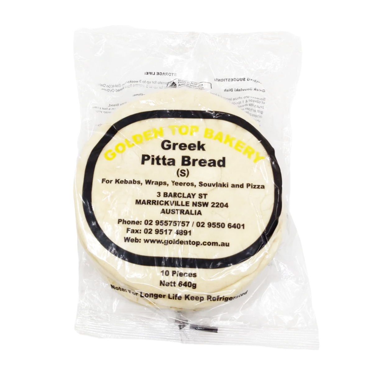 Golden Top Bakery Pitta Bread Small x10 640g: Enjoy fresh and fluffy pitta bread with our convenient pack of 10. Perfect for sandwiches, dips, or wraps. Made with high-quality ingredients for a delicious and satisfying meal. Ideal for quick and easy lunches or snacks. Order now for a tasty and versatile addition to your pantry!
