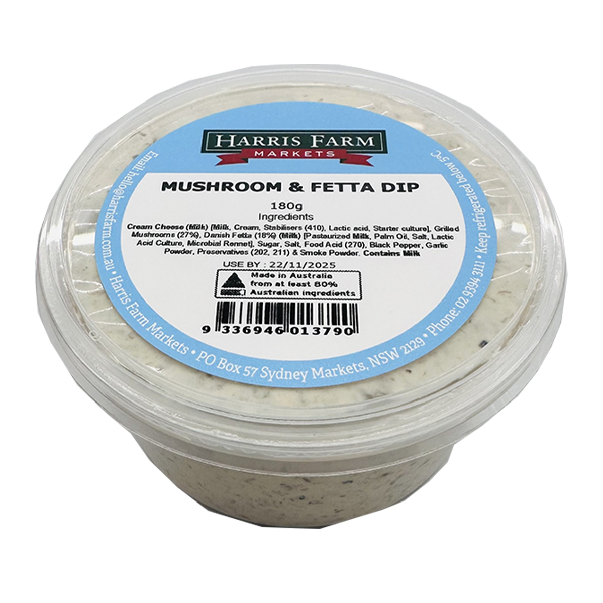 Harris Farm Mushroom & Fetta Dip 180g: Indulge in a creamy blend of earthy mushrooms and tangy fetta cheese. Perfect for snacking, entertaining, or adding a gourmet touch to your meals. Elevate your culinary experience with this irresistible dip.