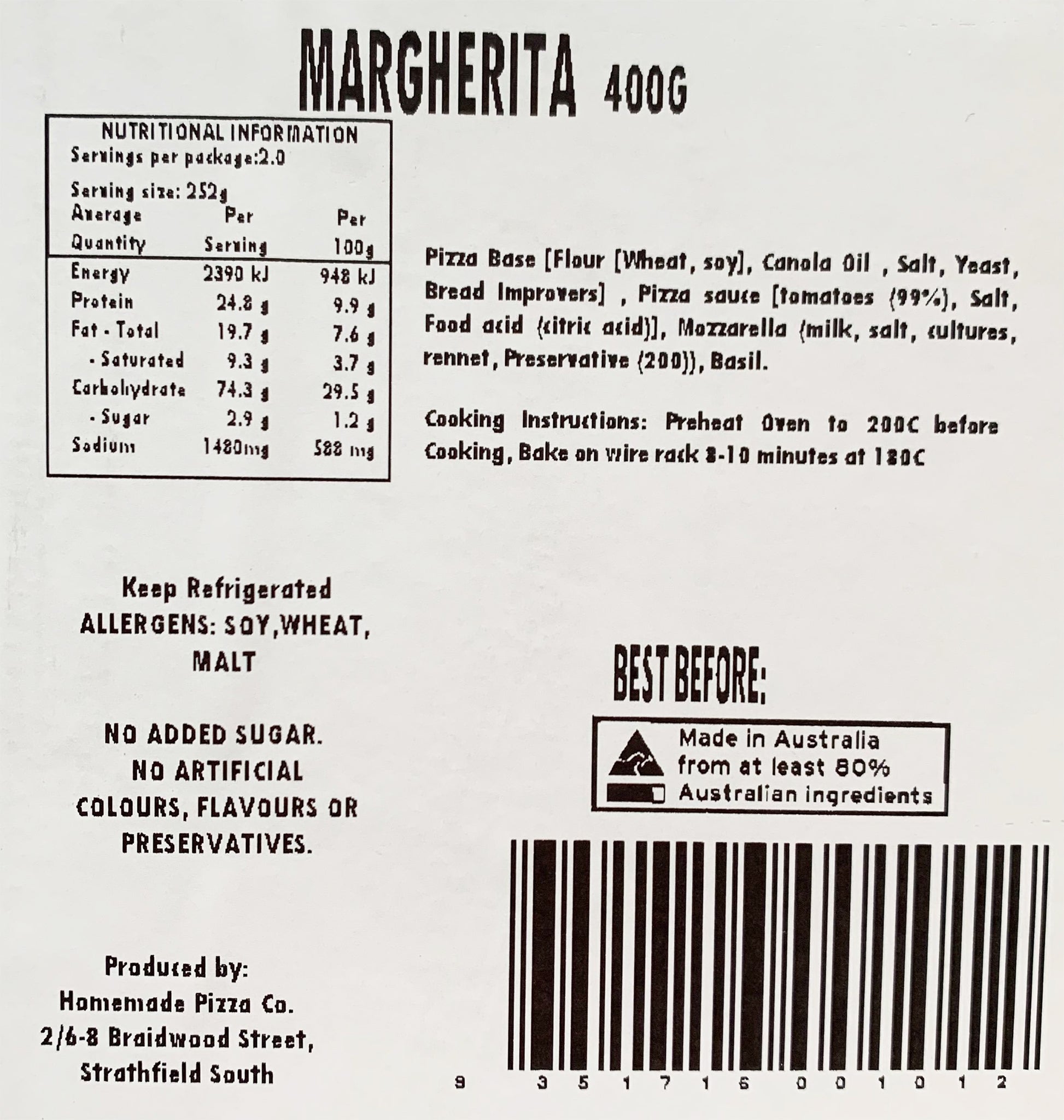 Delicious Homemade Pizza Co Margherita Pizza - a classic favorite made with premium ingredients. Enjoy the perfect blend of gooey mozzarella, tangy tomato sauce, and fresh basil on a crispy crust. Conveniently sized at 400g, it's the ideal choice for a quick and satisfying meal. Elevate your pizza night with this authentic Italian taste experience.