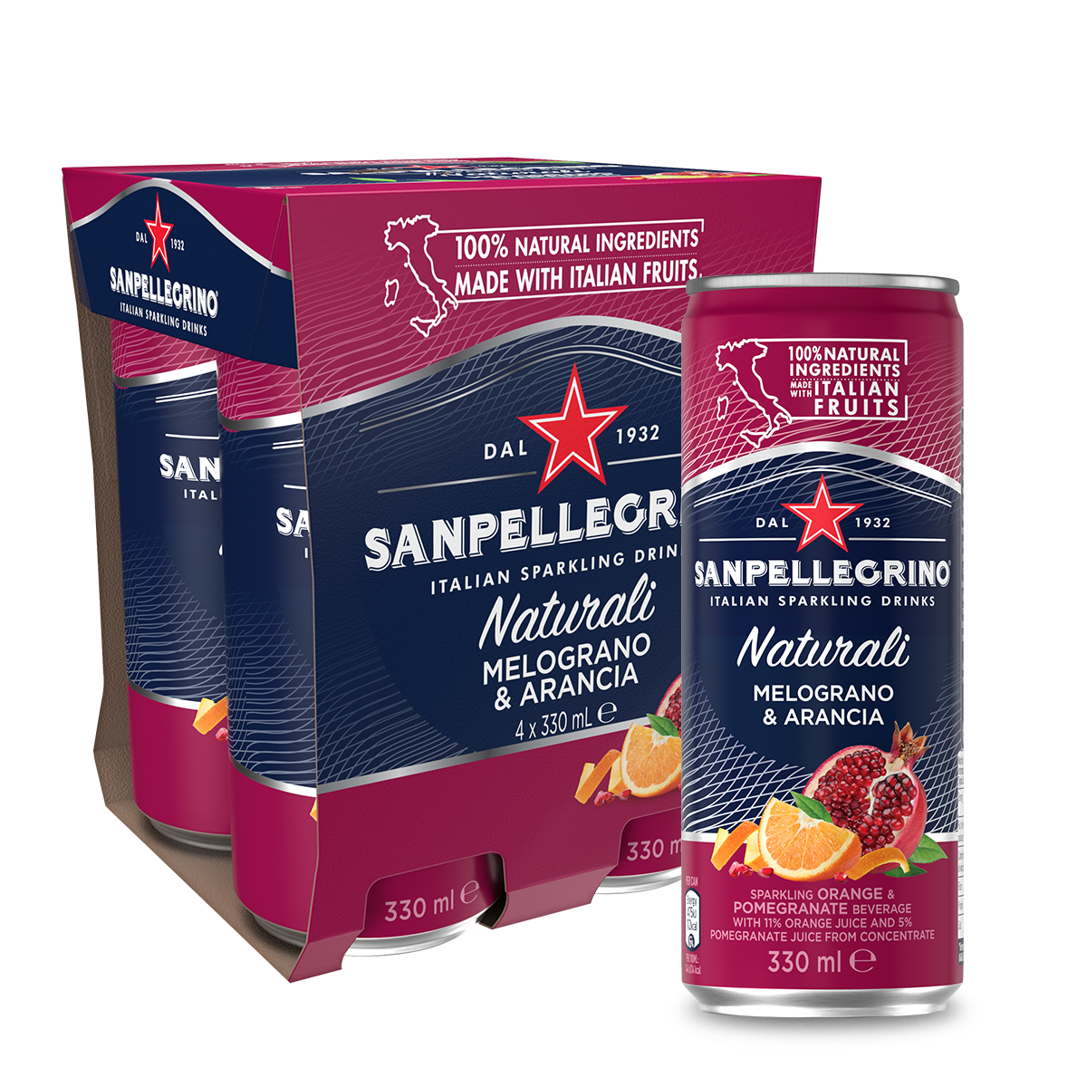 San Pellegrino Melograno and Arancia 4 x 330ml: Indulge in the refreshing blend of pomegranate and orange flavors with San Pellegrino's sparkling beverage. Perfect for a burst of Italian zest on-the-go or at home. Enjoy the crisp taste and vibrant bubbles of San Pellegrino Melograno and Arancia today!