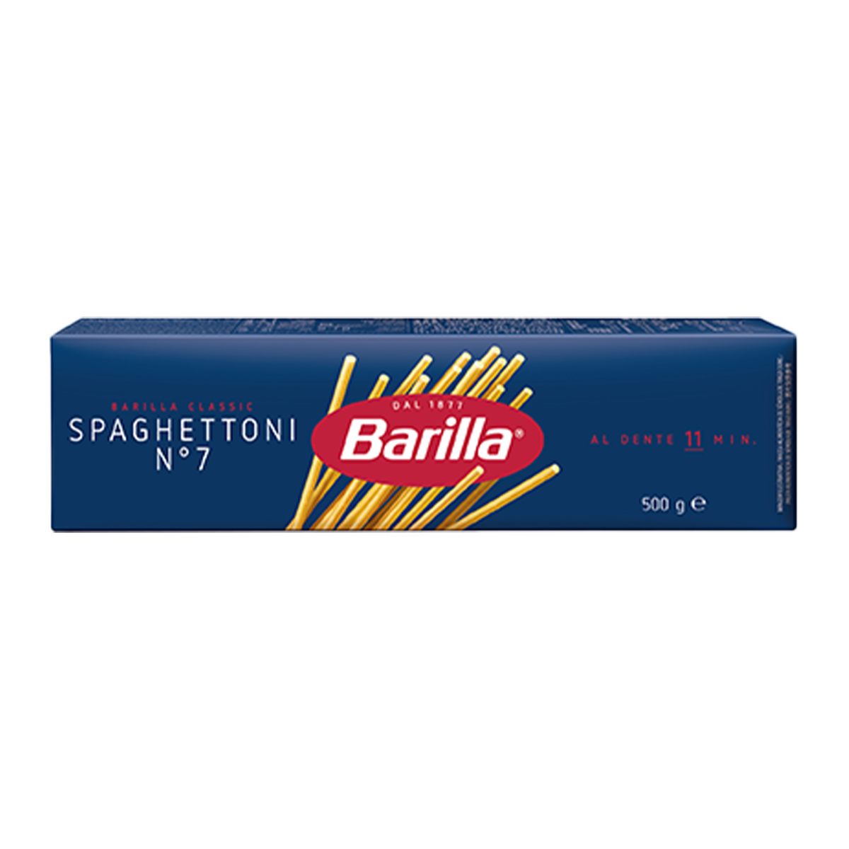 Barilla Pasta Spaghettoni N.7 500g: Enjoy authentic Italian taste with our long, thick spaghetti noodles. Made from high-quality durum wheat, our pasta cooks to perfection every time. Elevate your dishes with Barilla's Spaghettoni N.7 - the secret ingredient for delicious meals.