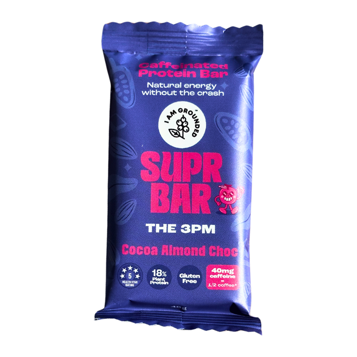 I Am Grounded Supr Bar Caffeinated Protein Bar Cocoa Almond Chocolate 45g provides a delicious energy boost with the perfect blend of cocoa, almond, and chocolate flavors. Packed with protein, this bar is a convenient and satisfying snack to keep you fueled and focused throughout the day.