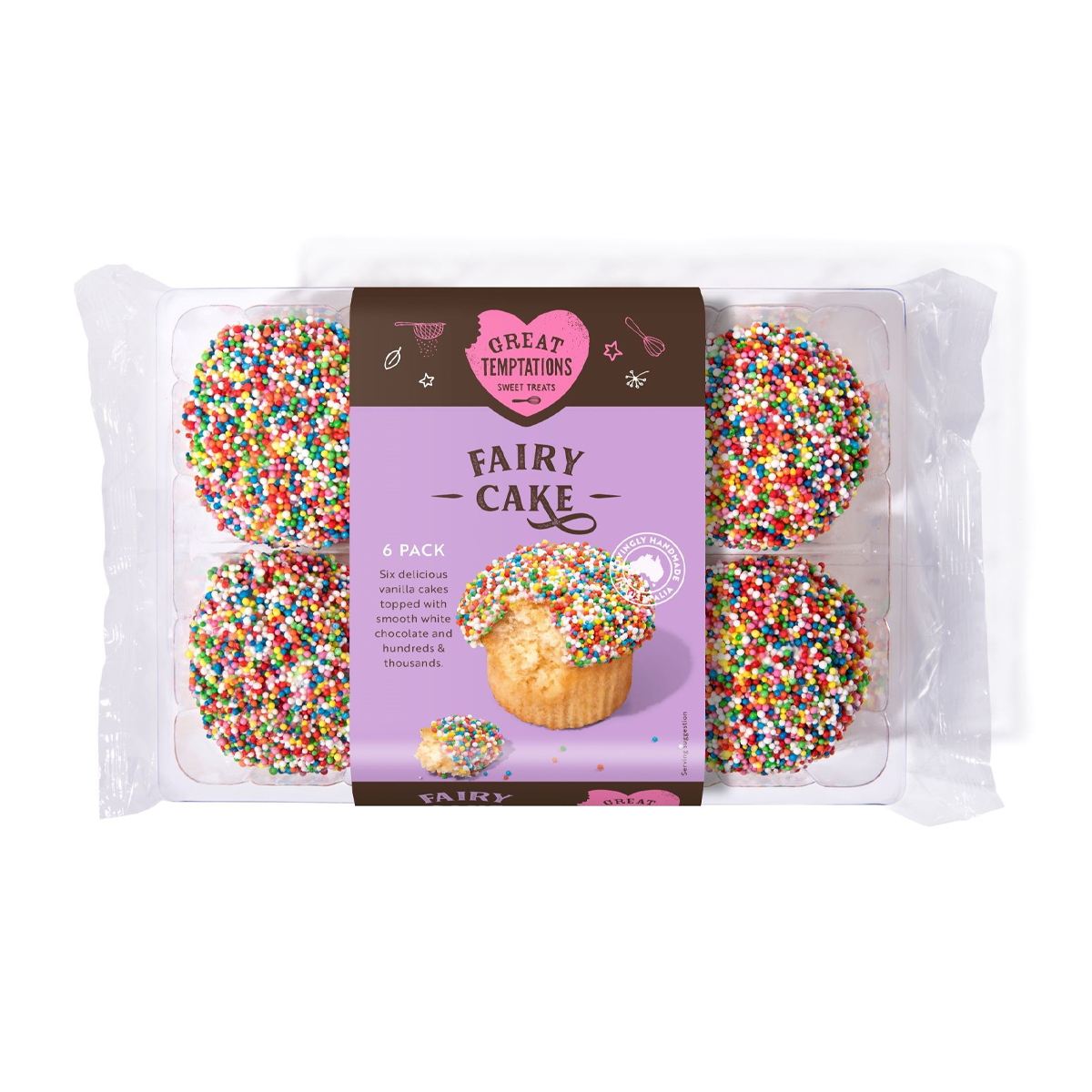Indulge in Great Temptations Fairy Cakes - a delightful treat for any occasion. With six delicious cakes in each pack, these moist and fluffy treats are perfect for satisfying your sweet cravings. Enjoy the convenience of pre-portioned servings that are ideal for sharing or enjoying on your own. Order now and experience the magic of Great Temptations Fairy Cakes!