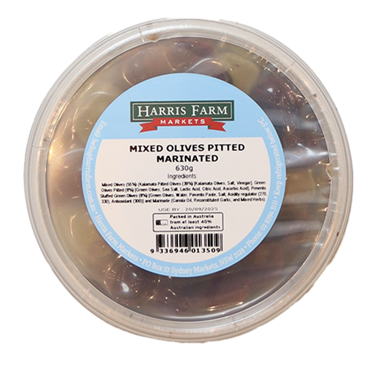 Harris Farm Mixed Olives Pitted 630g: Enjoy a flavorful blend of premium olives without the hassle of pits. Perfect for salads, charcuterie boards, or snacking. Elevate your meals with these high-quality, convenient olives.