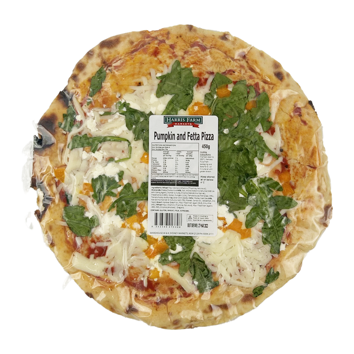 Delicious Harris Farm Pizza Pumpkin and Fetta 450g - a mouthwatering blend of savory pumpkin and creamy fetta cheese on a crispy crust. Perfect for a quick and satisfying meal that will leave you craving for more. Order now for a delightful dining experience!