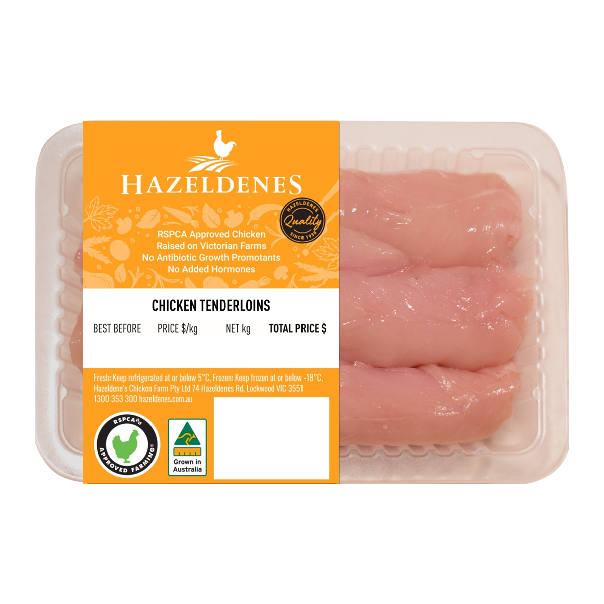 Hazeldenes RSPCA Chicken Tenderloins 550-650g: Ethically sourced, premium quality chicken tenderloins that are tender, juicy, and perfect for quick and easy meals. Enjoy delicious, guilt-free dining with these RSPCA-approved chicken tenderloins.