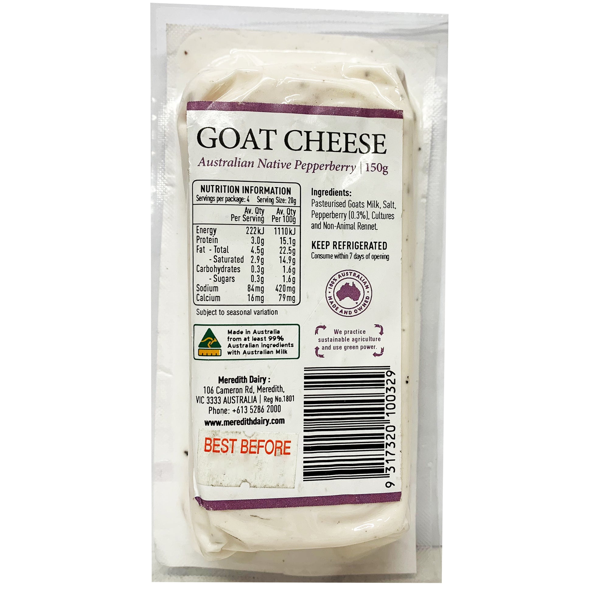 Meredith Dairy Goat Cheese Fresh Chevre Australian Native Pepperberry 150g offers a unique blend of creamy goat cheese with a hint of native Australian pepperberry. Elevate your dishes with this flavorful and versatile cheese, perfect for adding a gourmet touch to your meals.