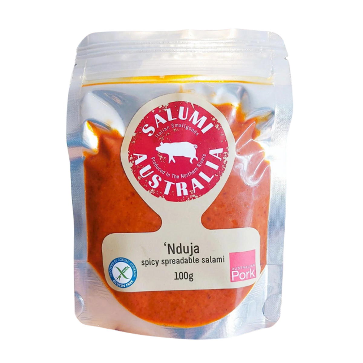 Spice up your meals with our flavorful Salumi Nduja 100g. Made with premium ingredients, this spreadable salami adds a delicious kick to any dish. Elevate your culinary creations with this authentic Italian delicacy.