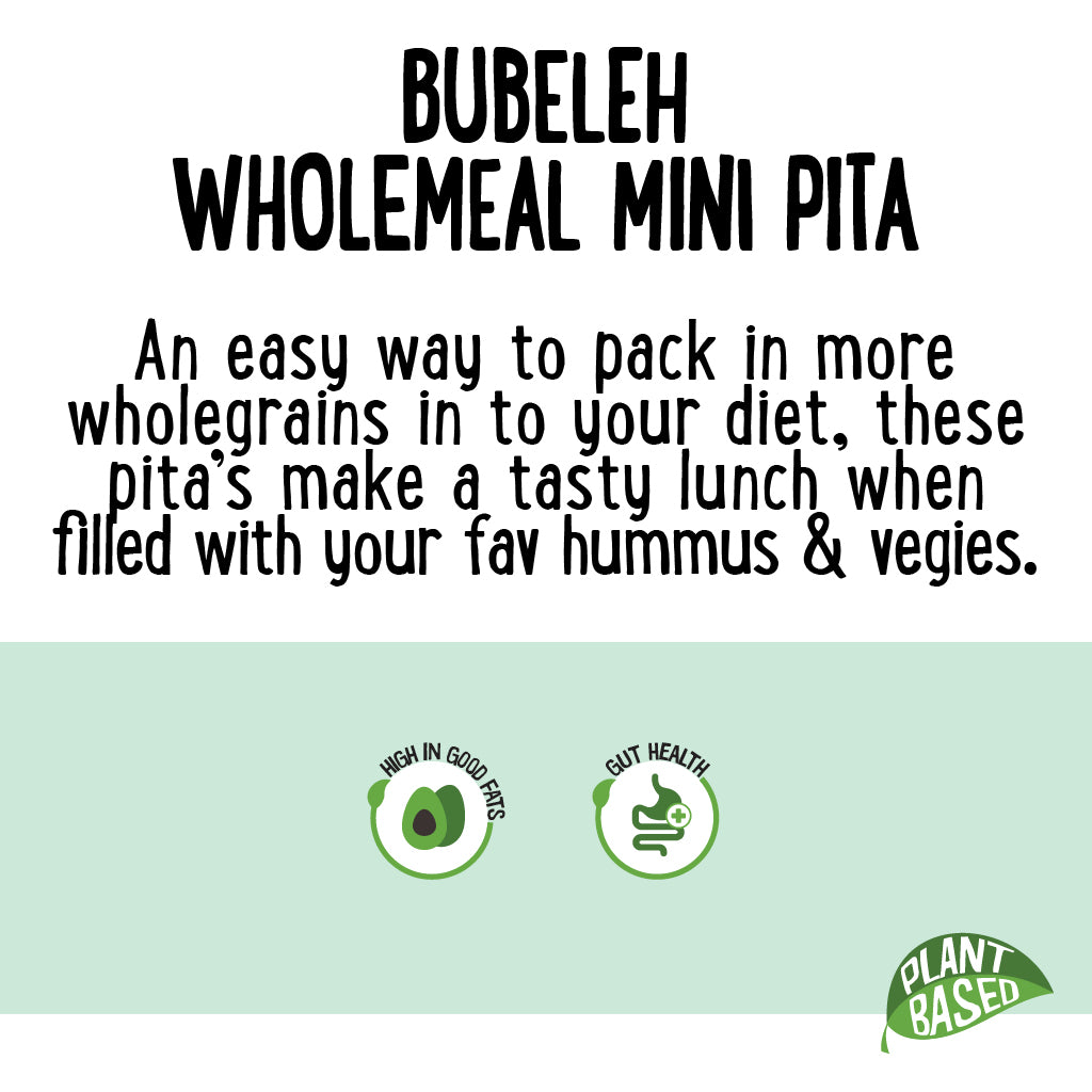 Bubeleh Bakery Wholemeal Mini Pita x5 300g: Enjoy guilt-free snacking with our delicious wholemeal mini pitas. Packed with fiber and nutrients, these pitas are perfect for a quick and healthy meal or snack. Order now for a tasty and nutritious treat!