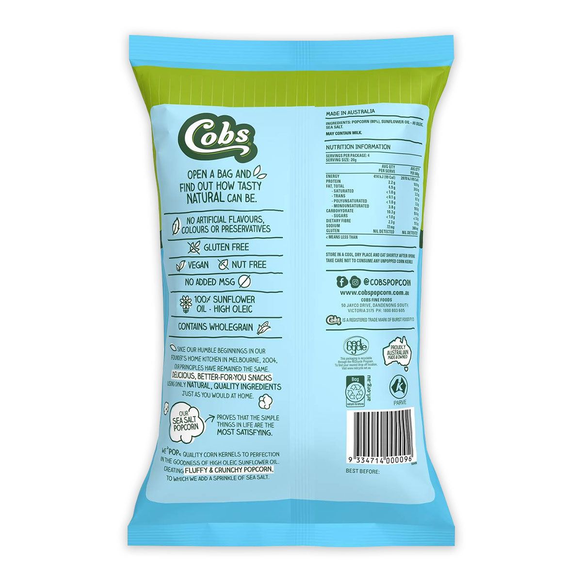 Cobs Natural Popcorn Sea Salt 80g: Enjoy guilt-free snacking with our light, fluffy popcorn seasoned with just the right amount of sea salt. Made with all-natural ingredients, this gluten-free and non-GMO snack is perfect for satisfying cravings anytime, anywhere. Treat yourself to a wholesome and delicious snack with Cobs Natural Popcorn Sea Salt 80g.