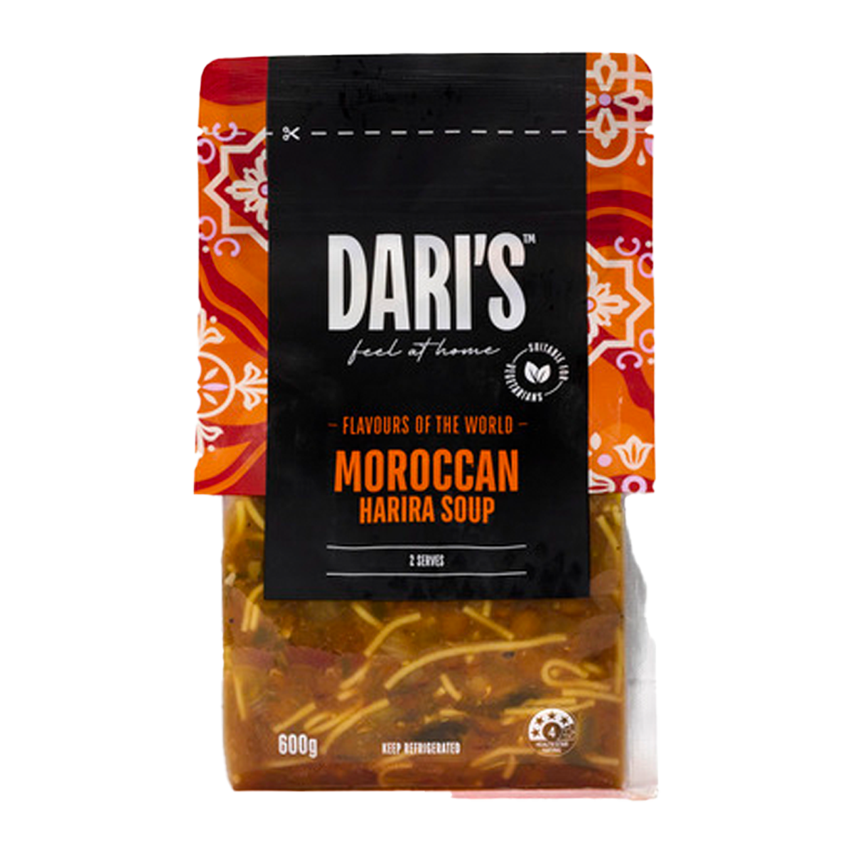 Experience the rich flavors of Morocco with Dari's Moroccan Harira Soup 600g. This hearty and authentic soup is packed with traditional spices and ingredients, perfect for a comforting and satisfying meal. Enjoy the taste of Morocco in every spoonful with Dari's Harira Soup.