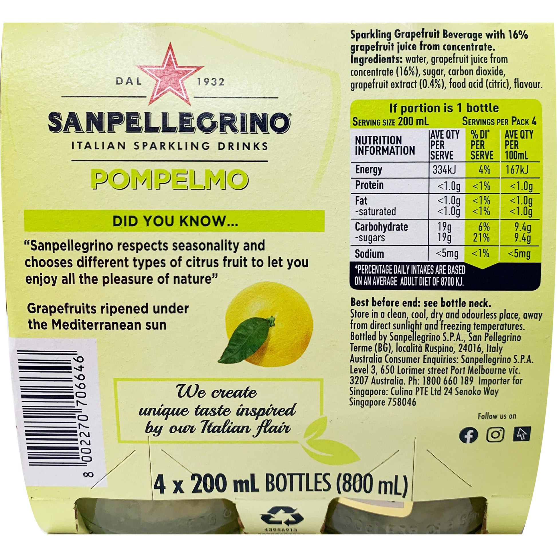 San Pellegrino Pompelmo 4 x 200ml: Refreshingly tangy and invigorating, this pack of 4 sparkling grapefruit beverages is the perfect way to elevate any occasion. Indulge in the crisp, citrusy flavor of San Pellegrino Pompelmo, crafted with premium ingredients for a taste that delights the senses. Enjoy the convenience of these 200ml cans, ideal for on-the-go refreshment. Elevate your hydration experience with San Pellegrino Pompelmo today.