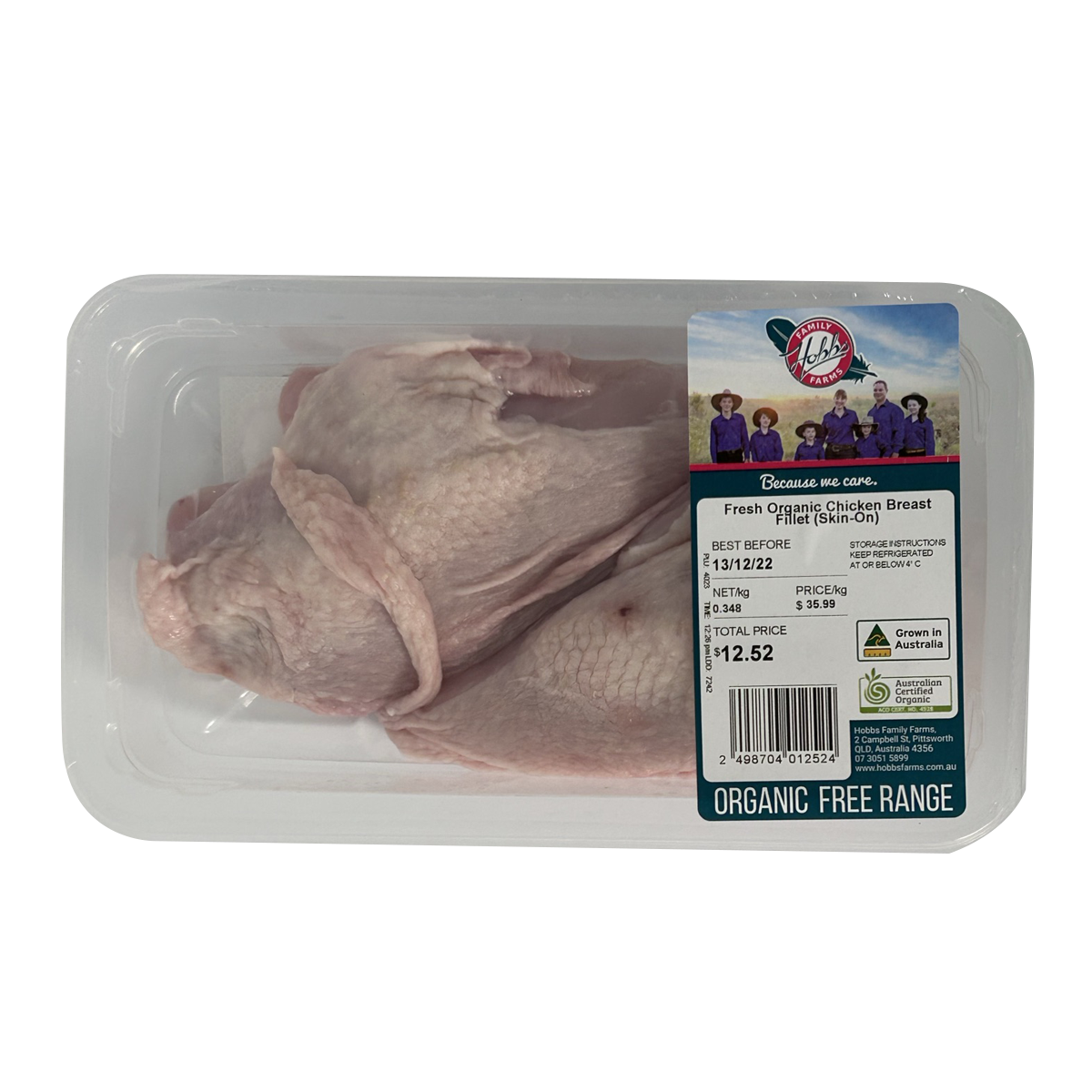 Tender and flavorful Hobbs Organic Chicken Breast with Skin On, weighing 350-500g. Enjoy premium quality, organic chicken that is perfect for a variety of delicious and healthy meals. Ideal for those seeking a natural and sustainable protein source.