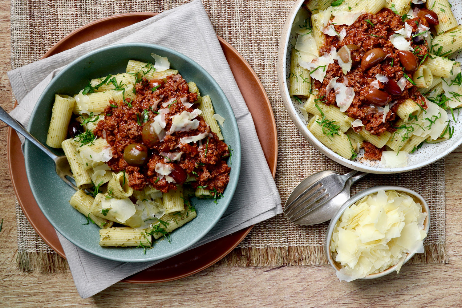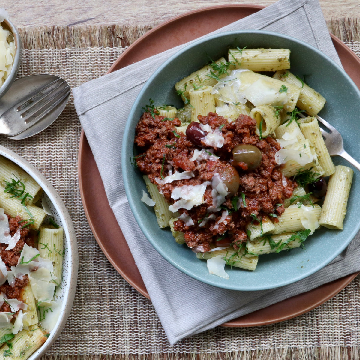 Kangaroo and Mixed Olives Rigatoni Bolognese