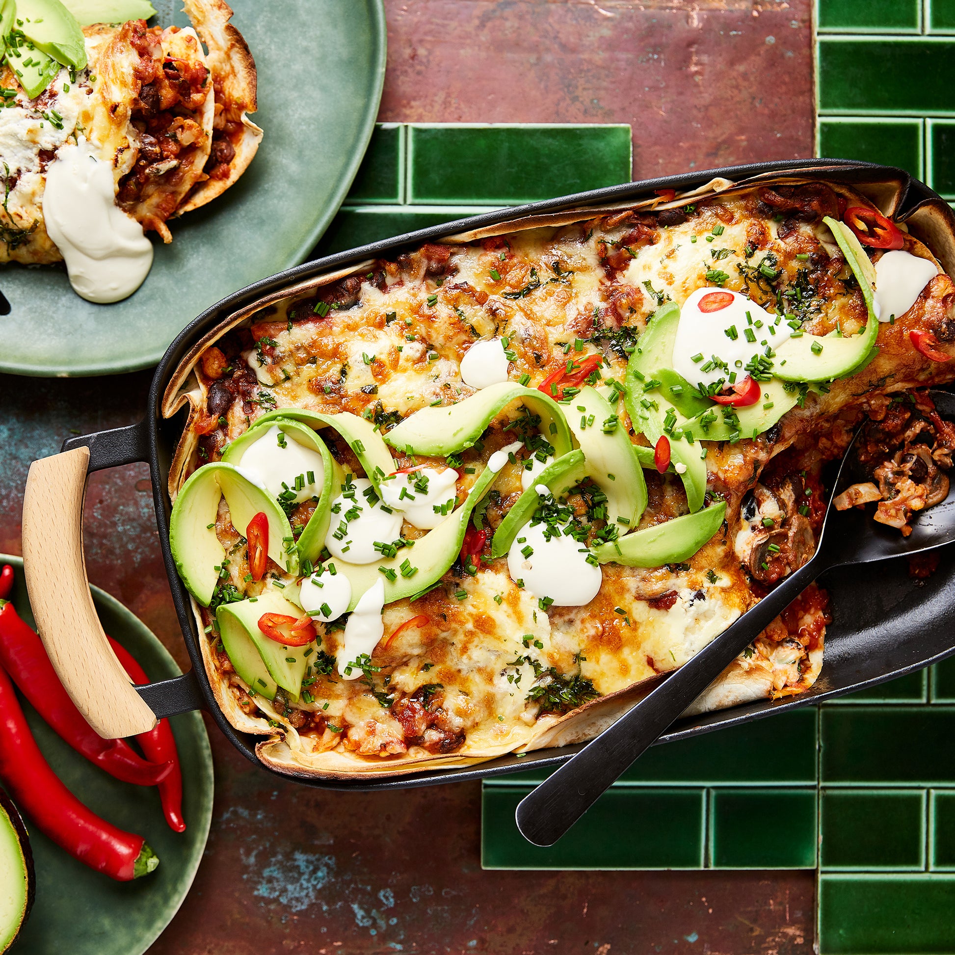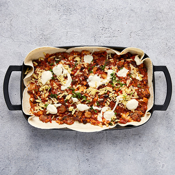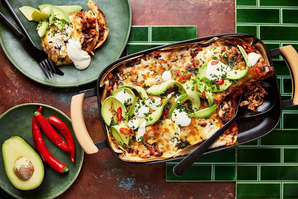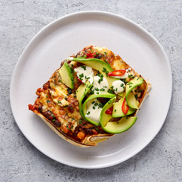 3. Place 4 of the tortillas on the baking dish so it covers the bottom of the tray. Add half of the bean mixture, top with half of the cheese and dollops of the sour cream (using only ½ of the sour cream). Place another layer of tortillas and repeat the previous step. Place the leftover tortilla on top and top with the remaining sauce and cheese. Bake for 10-15min. Meanwhile, chop the red chilli (optional) and slice the avocado.