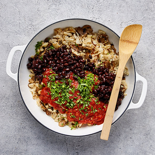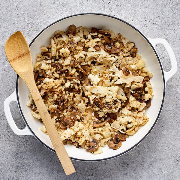 1. Preheat oven to 220°C. In a large frying pan on high heat, drizzle olive oil, add the sliced mushrooms and sauté for approx. 3-4 min. Roughly chop the cauliflower, add to the pan, and stir for another 2 min.