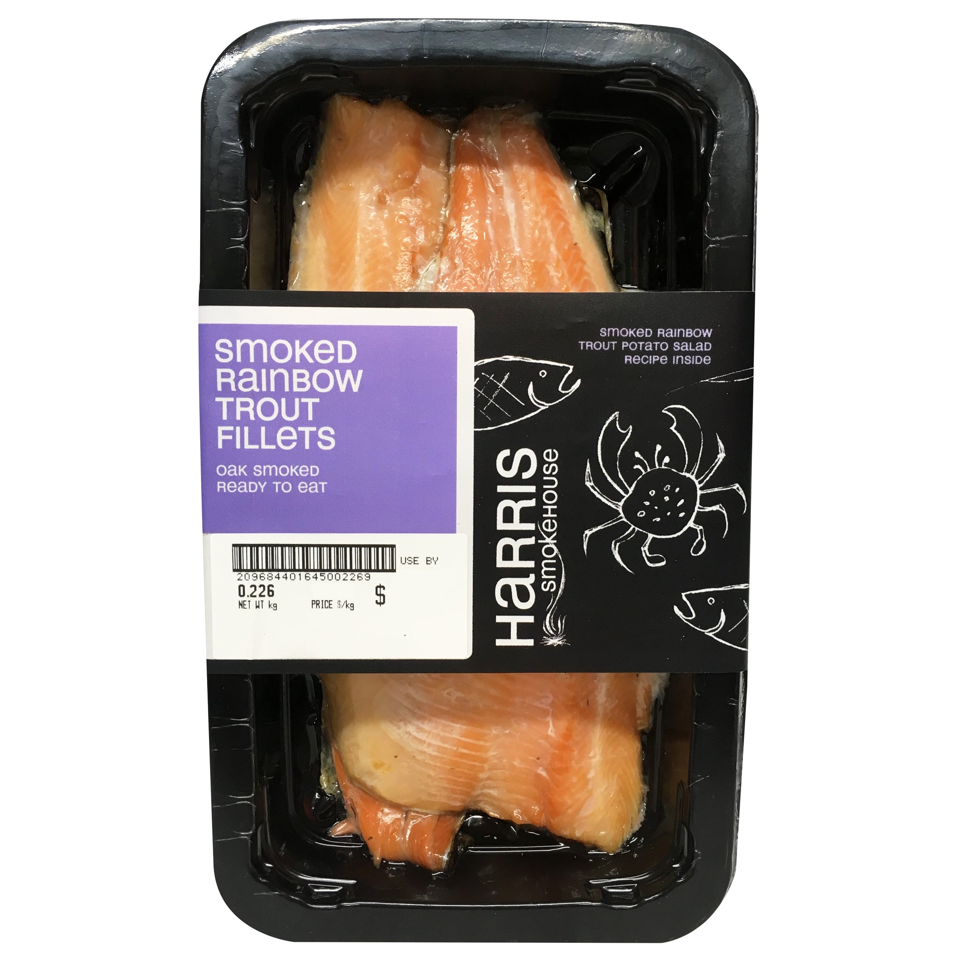 Savor the rich, smoky flavor of Harris Smokehouse Smoked Rainbow Trout Fillets. Indulge in premium quality, prepacked fillets weighing 150-250g each. Perfect for a quick and delicious meal, these trout fillets are a gourmet delight for seafood lovers.