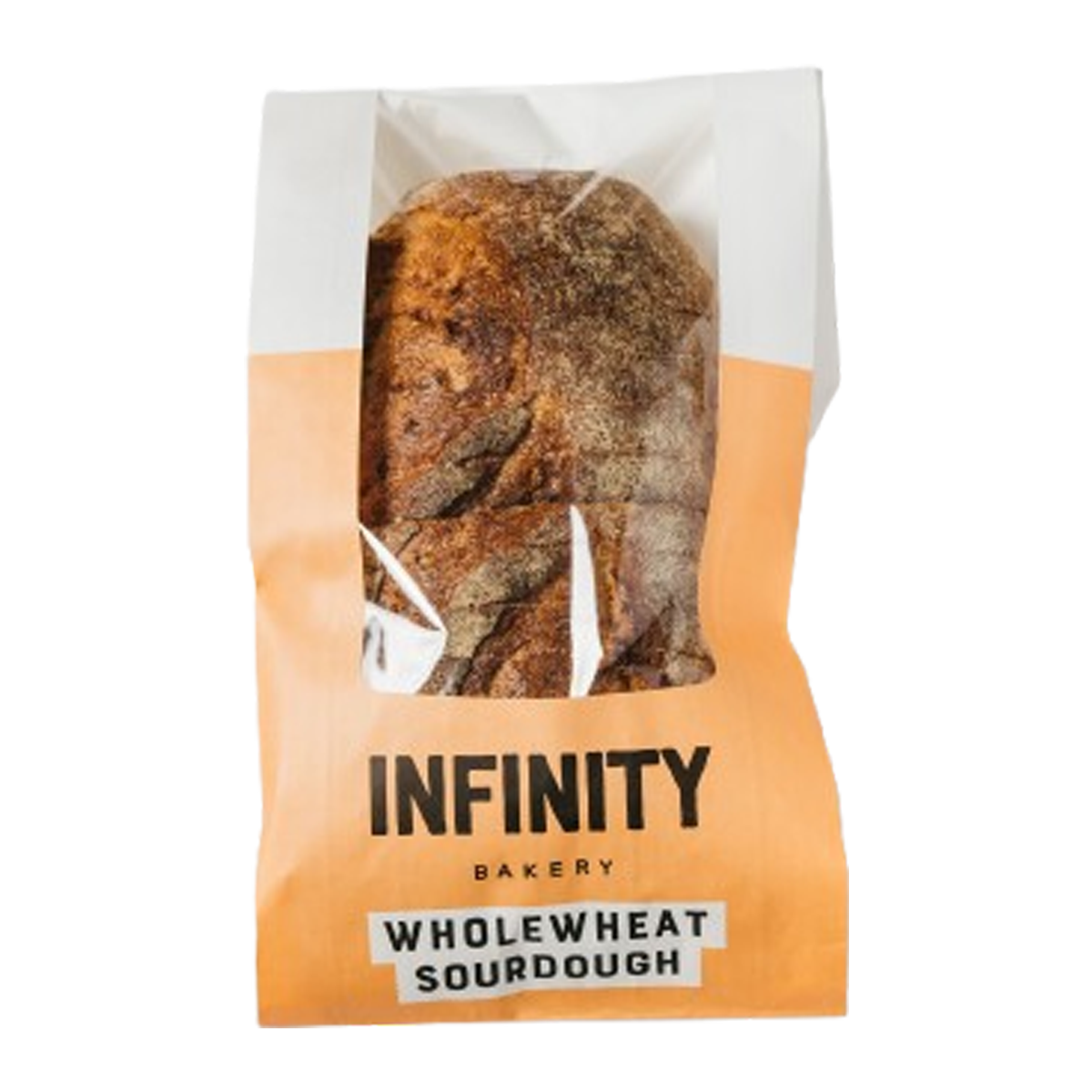Infinity Bakery Wholewheat Sourdough 680g: Indulge in the perfect blend of rustic flavor and wholesome goodness with our Wholewheat Sourdough. Made with premium ingredients and baked to perfection, this artisanal bread is rich in fiber, nutrients, and irresistible taste. Elevate your meals with every slice and savor the goodness of Infinity Bakery's finest creation. Order now and experience the true essence of authentic sourdough bread!