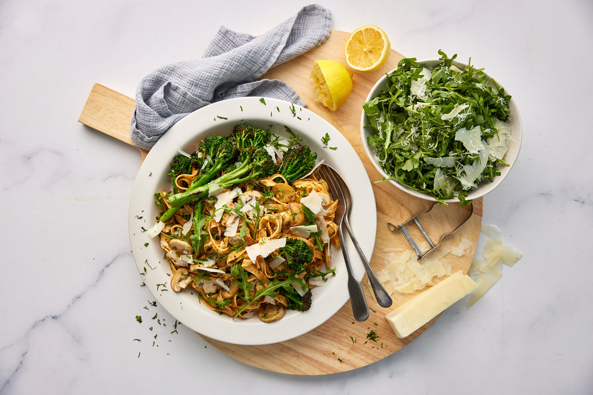 Sundried Tomato Pesto Tagliatelle with Mushrooms and Broccolini