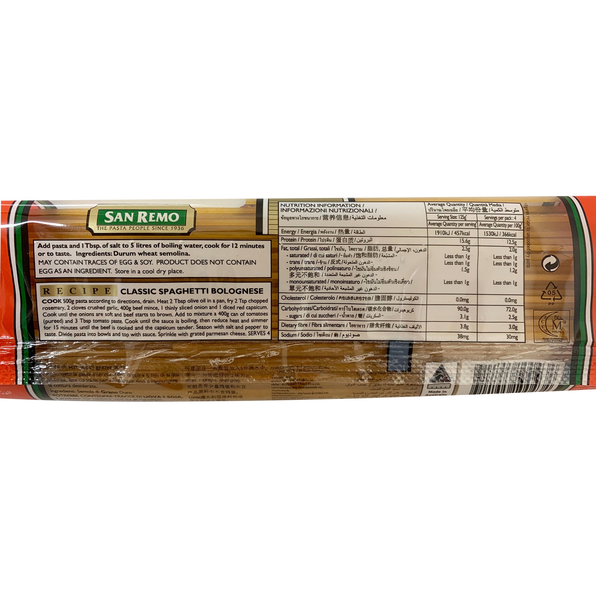 San Remo Durum Wheat Spaghetti No.5 500g offers authentic Italian taste and superior quality. Made from premium durum wheat, this pasta cooks to perfection every time, delivering a delicious al dente texture. Elevate your pasta dishes with San Remo's finest spaghetti, a pantry essential for pasta lovers.