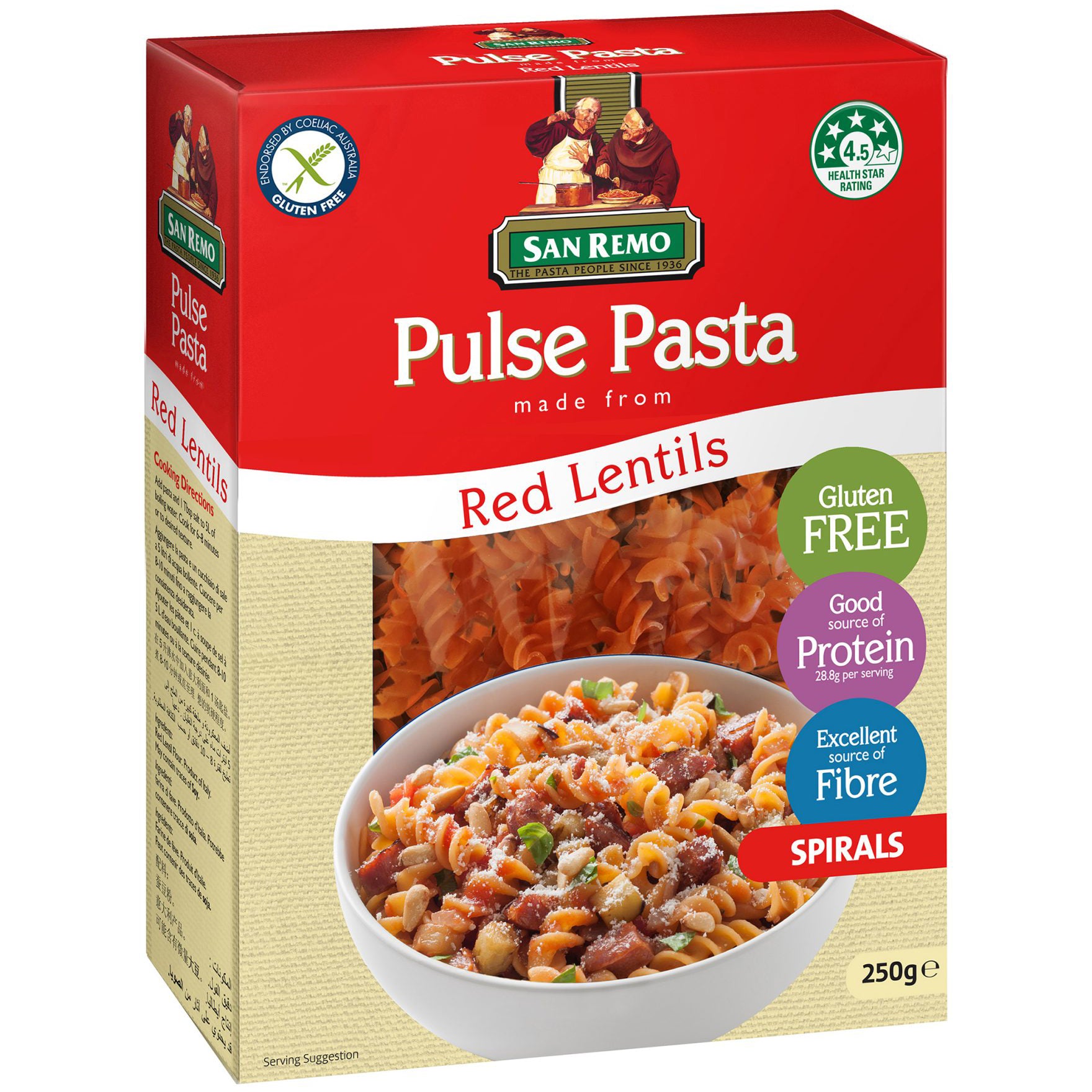 San Remo Pulse Pasta Spirals Red Lentils 250g: High-protein, gluten-free pasta that boosts energy and supports a healthy lifestyle. Enjoy delicious meals guilt-free!