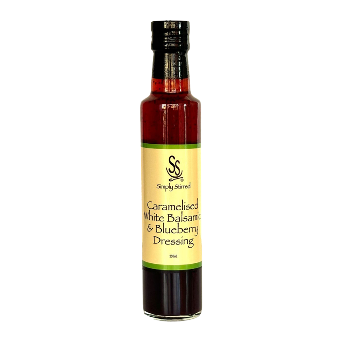 Simply Stirred White Balsamic Blueberry Dressing 250ml: Elevate your salads with our exquisite blend of tangy white balsamic and sweet blueberries. Crafted with premium ingredients, this dressing adds a burst of flavor to your dishes. Try it now for a delightful and refreshing twist to your meals!