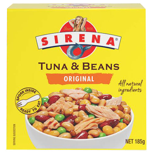Sirena Tuna and Beans Original 185g: A protein-packed, flavorful blend of premium tuna and hearty beans. Perfect for quick, nutritious meals. Enjoy the convenience and taste of Sirena's high-quality ingredients in every bite. Ideal for busy individuals looking for a delicious and satisfying meal option.