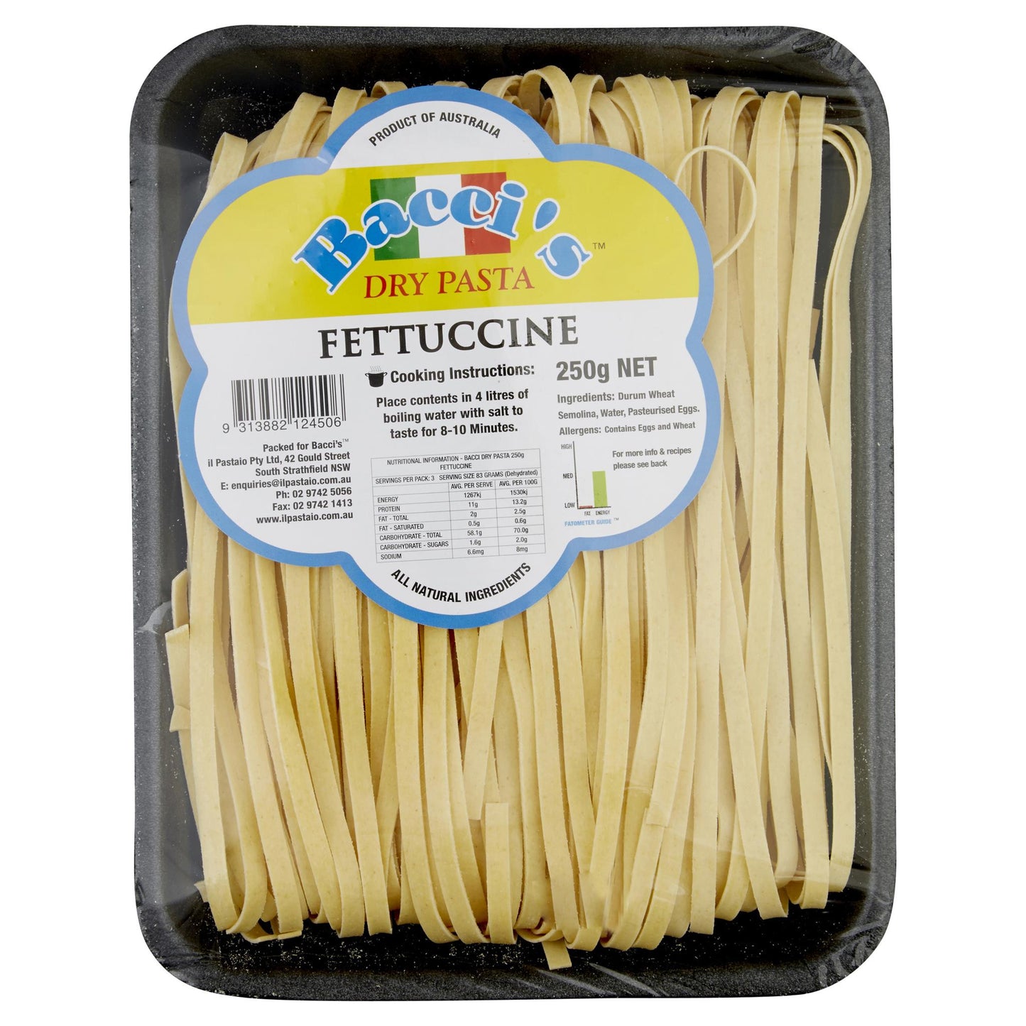Experience the authentic taste of Italy with Bacci's Fettuccine 250g. Made from premium durum wheat, this pasta offers a fresh, rich flavor and perfect al dente texture. High in protein and low in fat, it's a healthy choice for your meals. Elevate your culinary creations today with Bacci's Fettuccine.