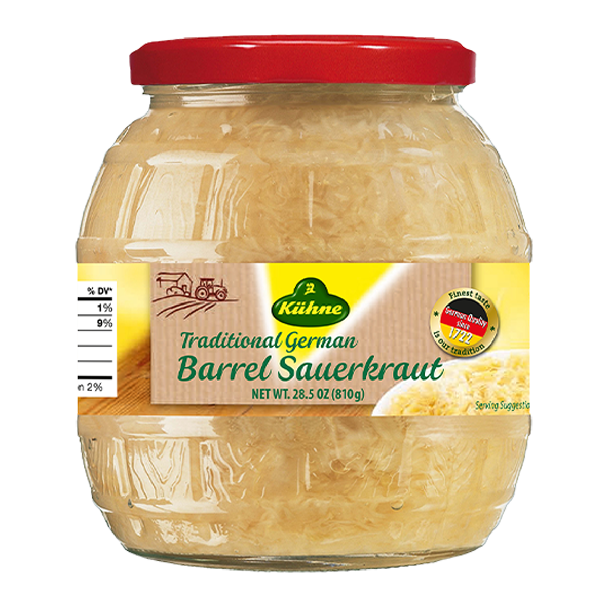 Kuhne Sauerkraut Traditional German Barrel 810g: Enjoy authentic German flavor with our premium sauerkraut. Packed with probiotics for gut health and made with quality ingredients, elevate your meals with a tangy twist. Perfect for adding a zesty kick to your dishes.