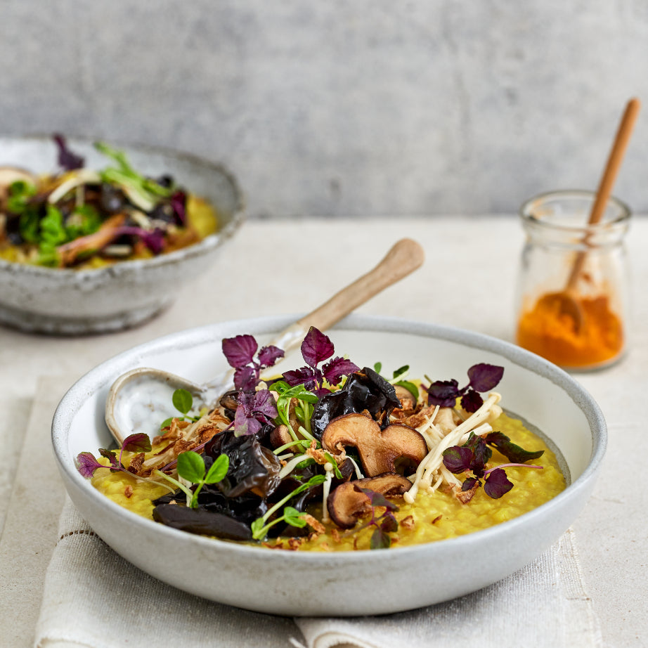 Turmeric Congee with Mixed Asian Mushrooms%}