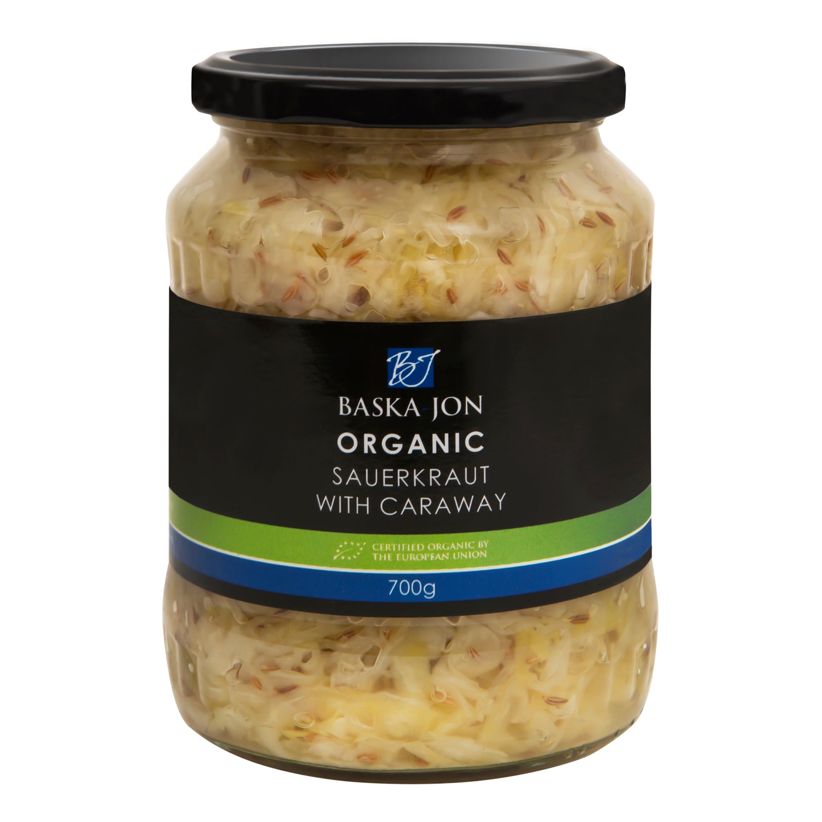 Baska Jon's Organic Sauerkraut with Caraway (700g) offers a delicious blend of tangy sauerkraut and aromatic caraway seeds. Packed with probiotics for gut health and made from organic ingredients, this flavorful condiment is a must-have for those seeking a tasty way to support their digestive system. Enjoy the benefits of traditional fermentation with every bite!