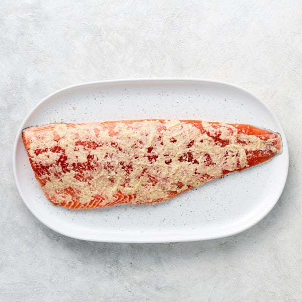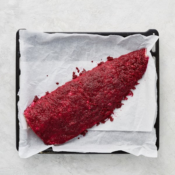 2. Spread the grated beetroot over the salmon then lightly pat so it sticks. Drizzle the salmon with olive oil and season again with salt and pepper. Cook in the oven for approx. 15 mins until just cooked, then rest for approx. 10 mins. When cut in the thickest part, the salmon should flake easily, be moist and be a slightly darker pink in the centre.