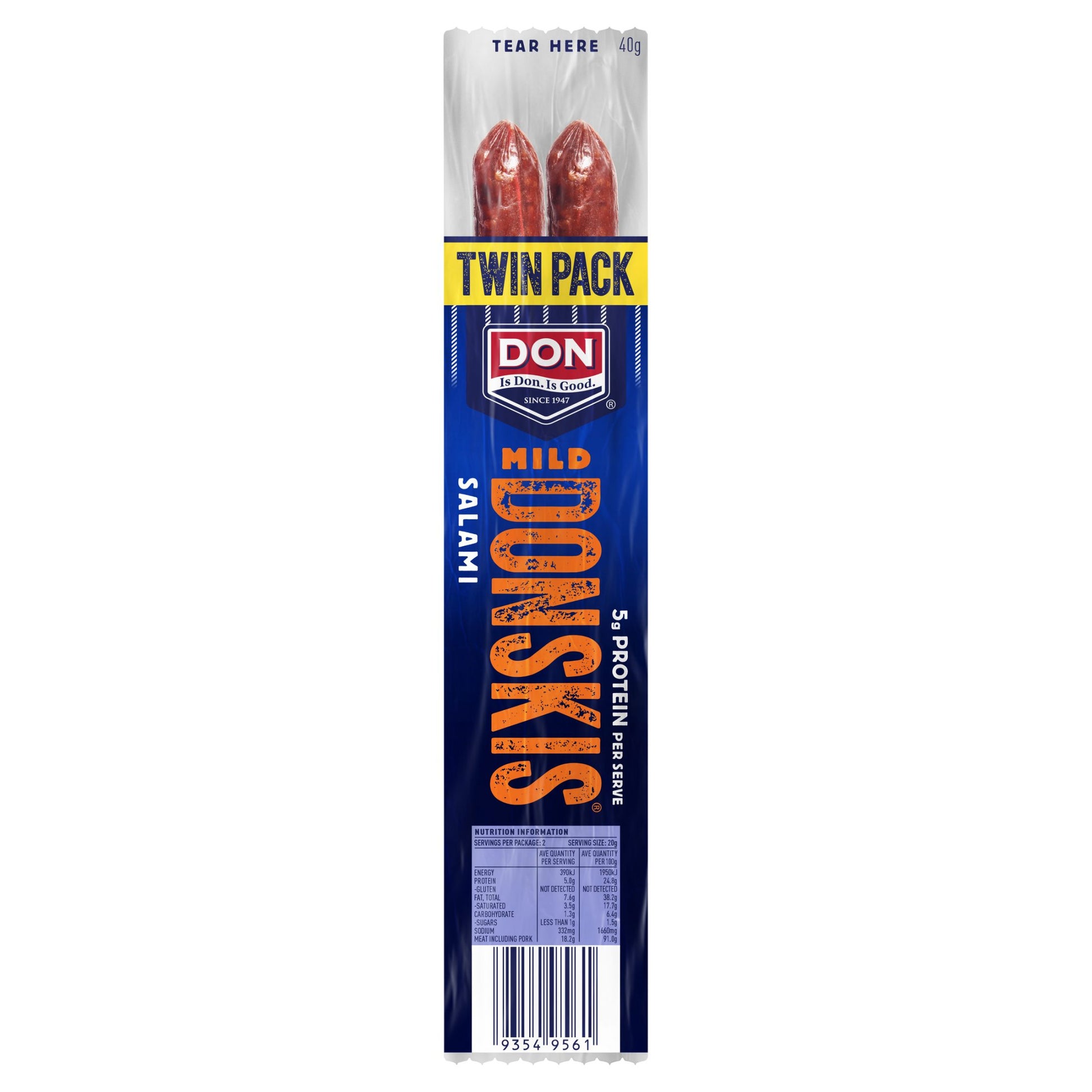 Don Donskis Mild Salami Twin Pack 40g offers a delectable blend of premium quality meat and savory spices, perfect for satisfying your cravings on the go. Indulge in this convenient snack that promises rich flavor in every bite. Ideal for busy individuals seeking a delicious and satisfying treat anytime, anywhere.