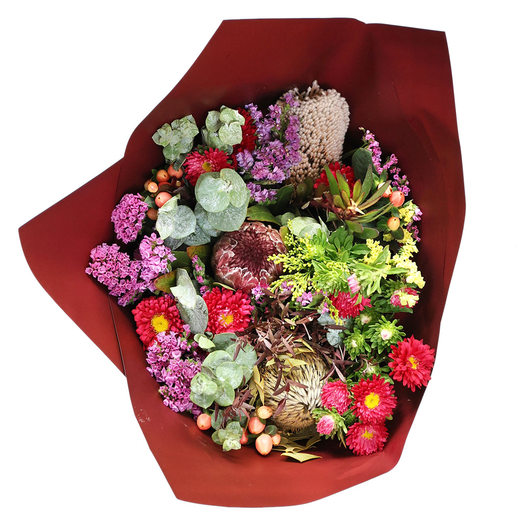 Bring the beauty of the Australian wilderness into your home with our stunning Flowers Australian Natives Bouquet Large. Bursting with vibrant colors and unique textures, this bouquet is a true celebration of nature's finest. Hand-picked for freshness and longevity, these native blooms will brighten any space. Order yours today!