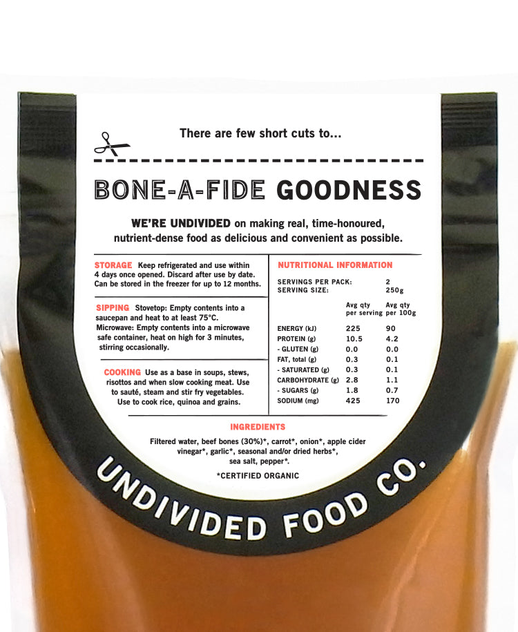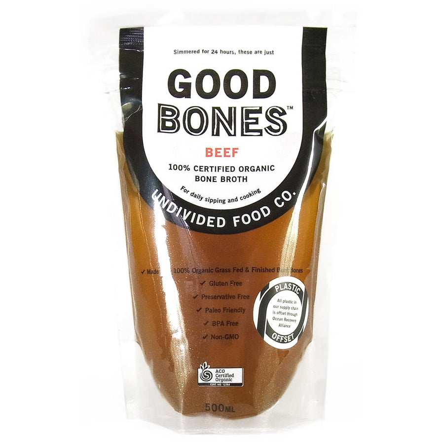 Good Bones Organic Beef Bone Broth 500ml: Nourish your body with our rich and flavorful bone broth, made from organic beef bones. Packed with essential nutrients and collagen, our broth supports gut health, joint function, and glowing skin. Elevate your wellness routine with every sip of our premium, organic bone broth.