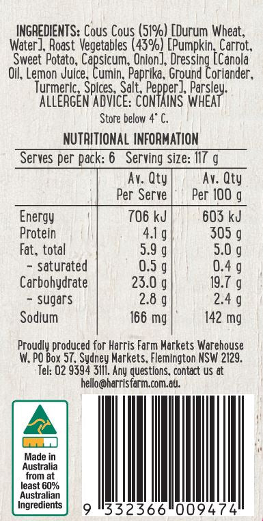 Enjoy a delicious and nutritious meal with Harris Farm Side Salad Roasted Veggies and Couscous 700g. Packed with flavorful roasted vegetables and fluffy couscous, this salad is a perfect balance of taste and health. Ideal for a quick and satisfying meal, this salad is a convenient and tasty option for busy days.