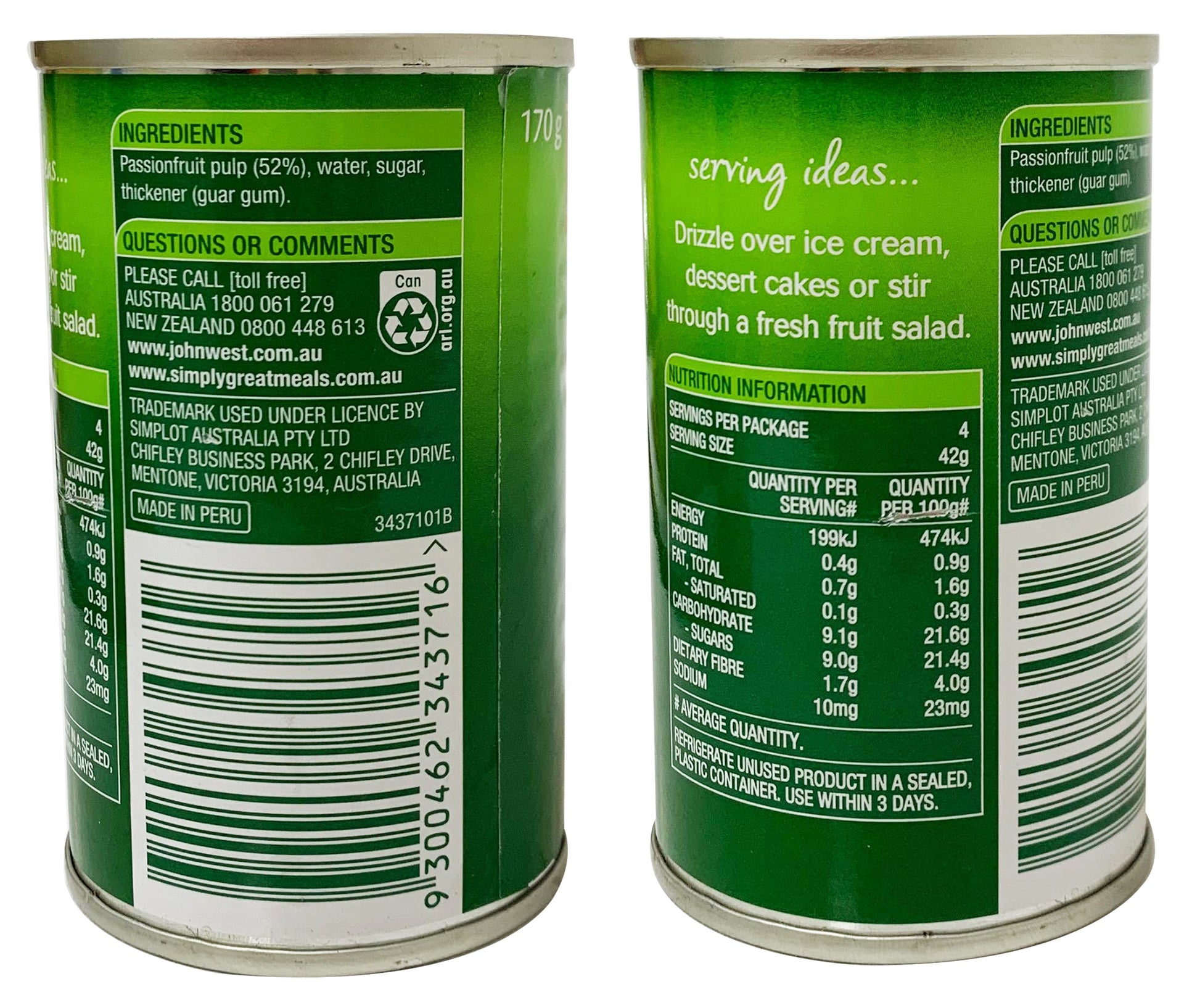 John West Passionfruit Pulp in Syrup 170g: Indulge in the tropical sweetness of ripe passionfruit with our premium pulp in syrup. Perfect for adding a burst of exotic flavor to your desserts, cocktails, and breakfast dishes. Elevate your culinary creations with the vibrant taste of John West Passionfruit Pulp.