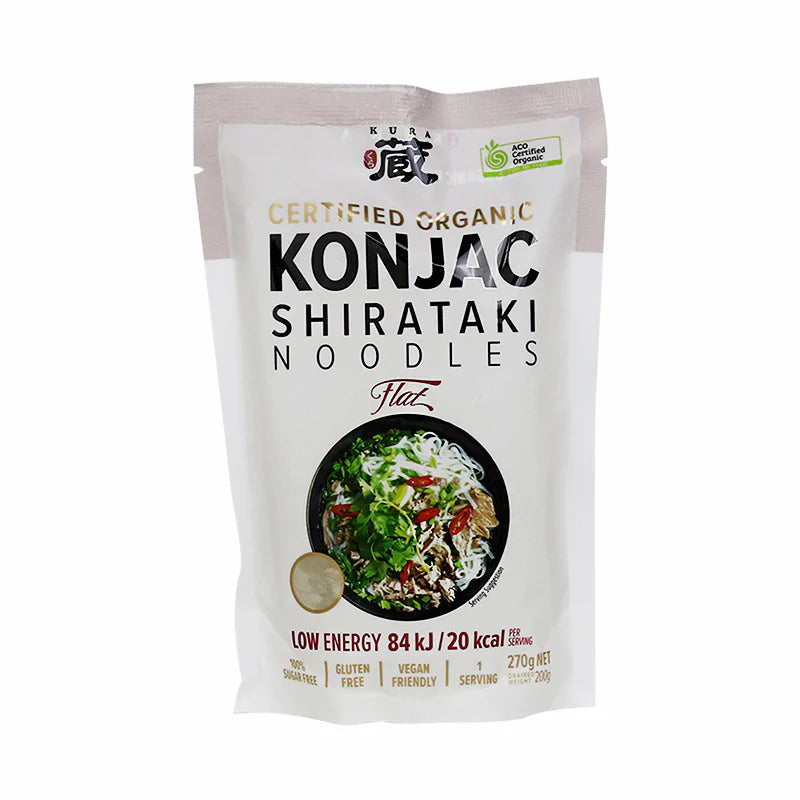 Kura Konjac Shirataki Noodles Flat 270g: Low-calorie, gluten-free noodles that satisfy cravings without the guilt. Perfect for weight management and promoting a healthy lifestyle. Enjoy a delicious and filling meal without compromising on taste or nutrition.