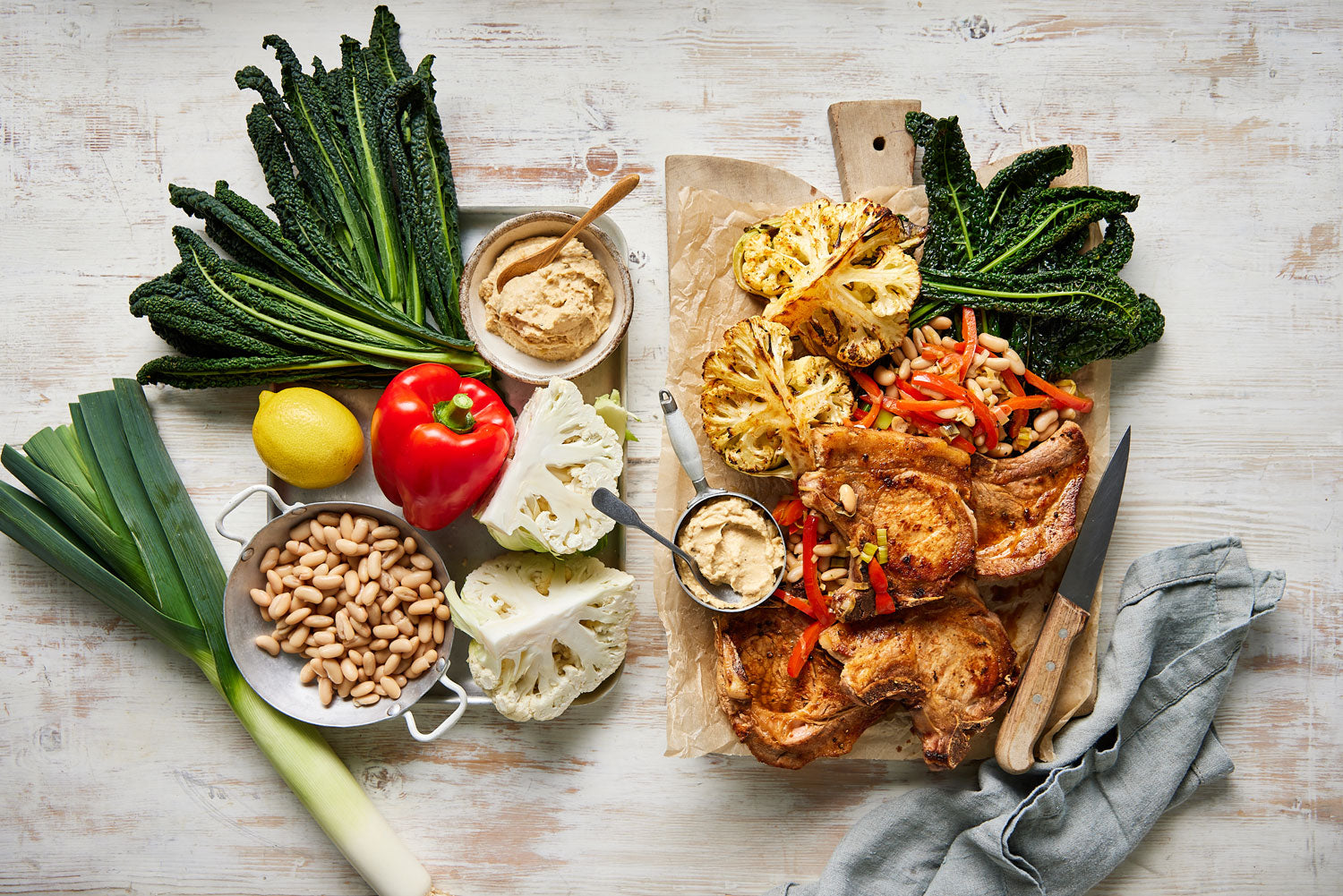 Lemon Honey Pork Chops - with Roasted Cauliflower and Bean Salad