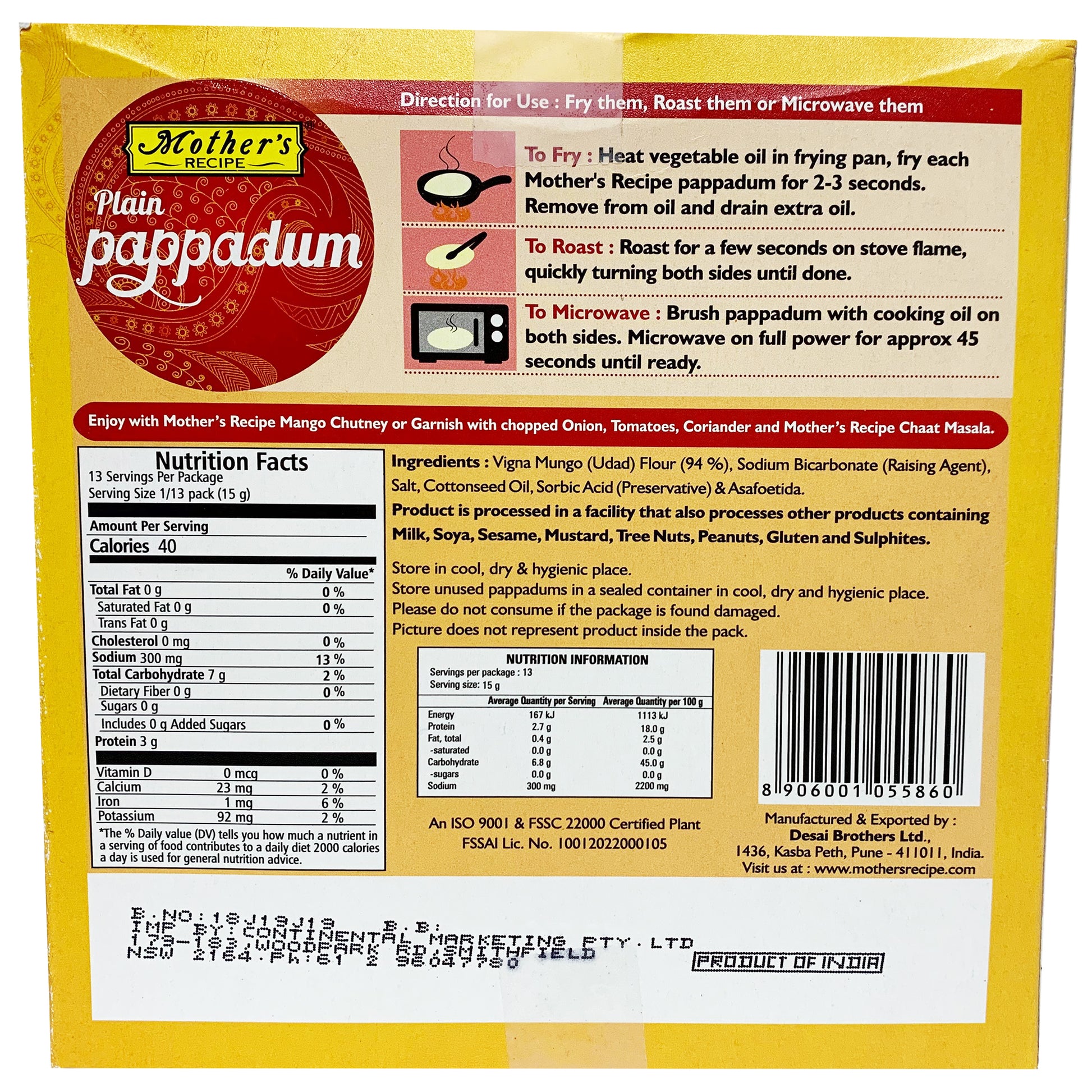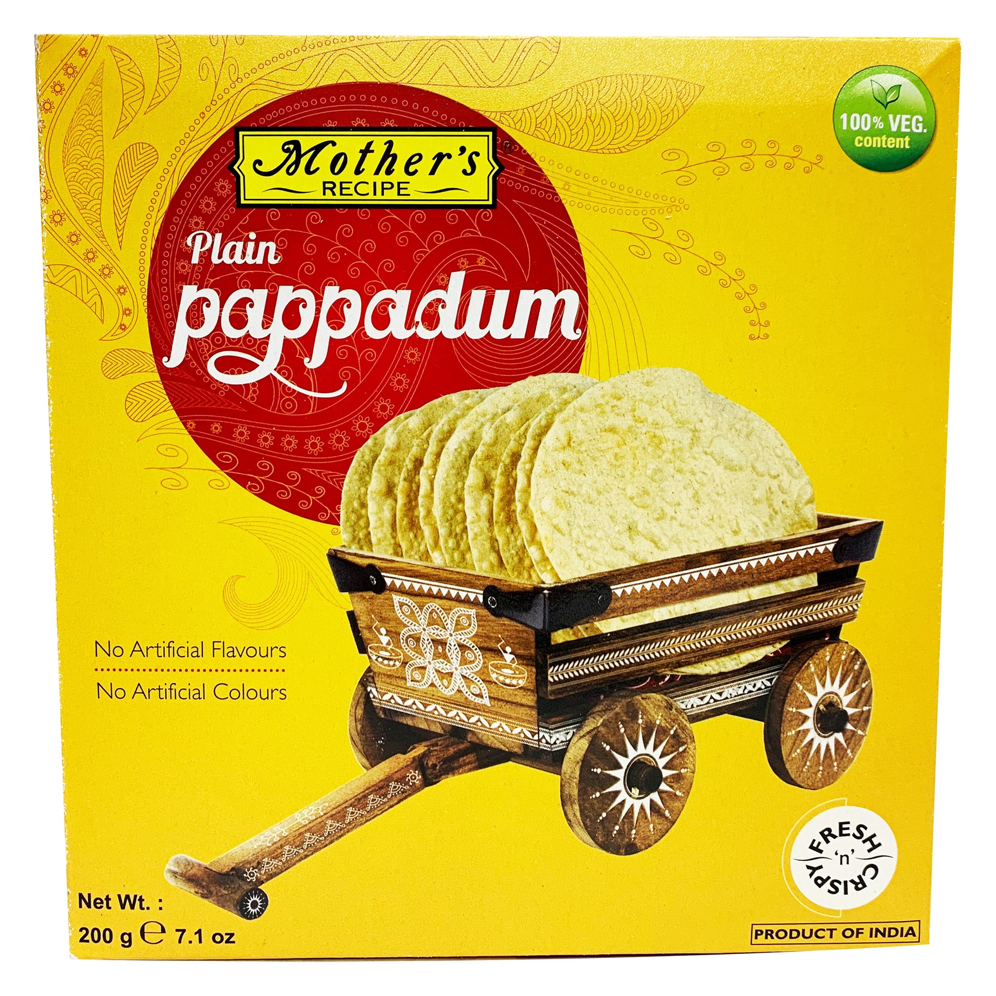 Mothers Recipe Plain Pappadum 200g: Authentic Indian snack bursting with flavor. Crispy, gluten-free, and easy to prepare. Perfect for quick meals or party appetizers. Enjoy the taste of India in every bite!
