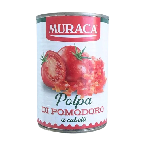 Muraca Polpa Chopped 400g: Premium quality Italian tomatoes, conveniently chopped for easy cooking. Elevate your dishes with rich flavor and vibrant color. Perfect for pasta sauces, soups, and stews. Experience the authentic taste of Italy in every bite.