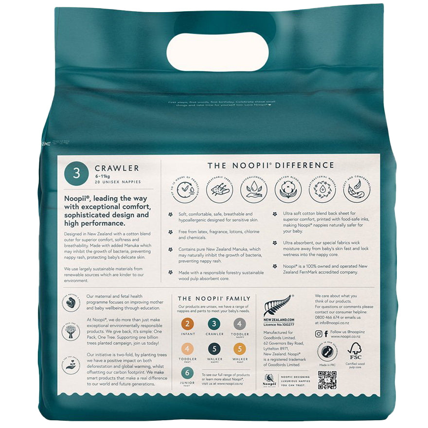 Discover the exceptional freshness and quality of Noopii Nappies 6-11kg N3 Crawler 20 Pack, crafted with care for your little one. Made with premium materials, these nappies boast a provenance you can trust, ensuring your baby experiences comfort and protection with every wear. Perfect for crawlers, these nappies offer a snug fit and reliable leak protection, making them ideal for active babies on the move. Embrace the peace of mind that comes with using a product that prioritizes both quality and sustainability, giving back to the environment while keeping your baby dry and happy. Choose Noopii for a natural, reliable solution that supports your baby's well-being and the planet.