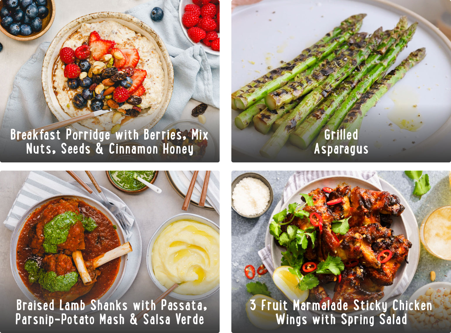 Value With Values Recipe Box - Breakfast Porridge, Grilled Asparagus, Braised Lamb Shanks and Sticky Chicken Wings